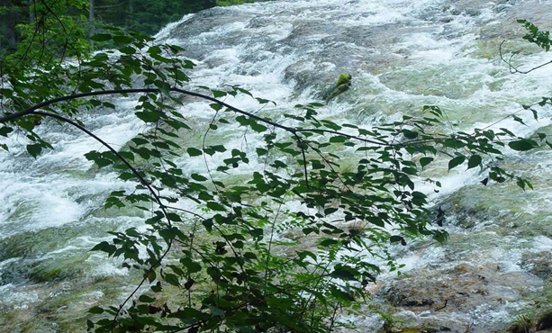 珍珠滩布满了坑洞,沿坡而下的激流在坑洞中撞击,溅起无数朵水花,在阳光照射下,点点水珠似珍珠洒落,“珍珠滩”之名由此而来。横跨珍珠滩有一道栈桥,栈桥的南侧水滩上布满了灌木丛,激流从桥下通过后,在北侧的浅滩上激起了一串串、一片片滚动跳跃的珍珠。迅猛的激流在斜滩上前行200米,就到了斜滩的悬崖尽头,冲出悬崖跌落在深谷之中,形成了雄伟壮观的珍珠滩瀑布。